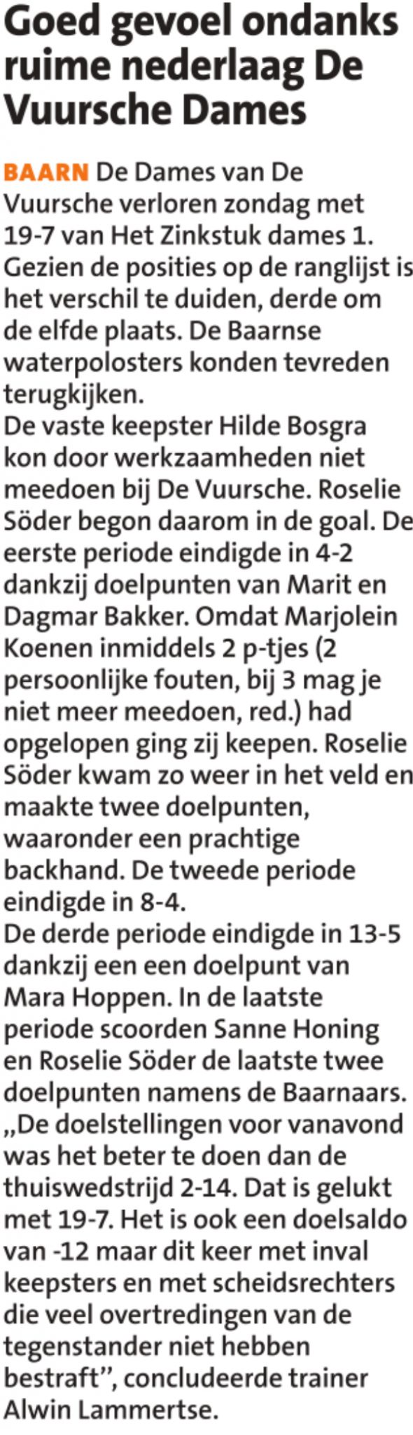 [BAARN] De Dames van De Vuursche verloren zondag met 19-7 van Het Zinkstuk dames 1. Gezien de posities op de ranglijst is het verschil te duiden, derde om de elfde plaats. De Baarnse waterpolosters konden tevreden terugkijken. De vaste keepster Hilde Bosgra kon door werkzaamheden niet meedoen bij De Vuursche. Roselie SΓΆder begon daarom in de goal. De eerste periode eindigde in 4-2 dankzij doelpunten van Marit en Dagmar Bakker. Omdat Marjolein Koenen inmiddels 2 p-tjes (2 persoonlijke fouten, bij 3 mag je niet meer meedoen, red.) had opgelopen ging zij keepen. Roselie SΓΆder kwam zo weer in het veld en maakte twee doelpunten, waaronder een prachtige backhand. De tweede periode eindigde in 8-4.