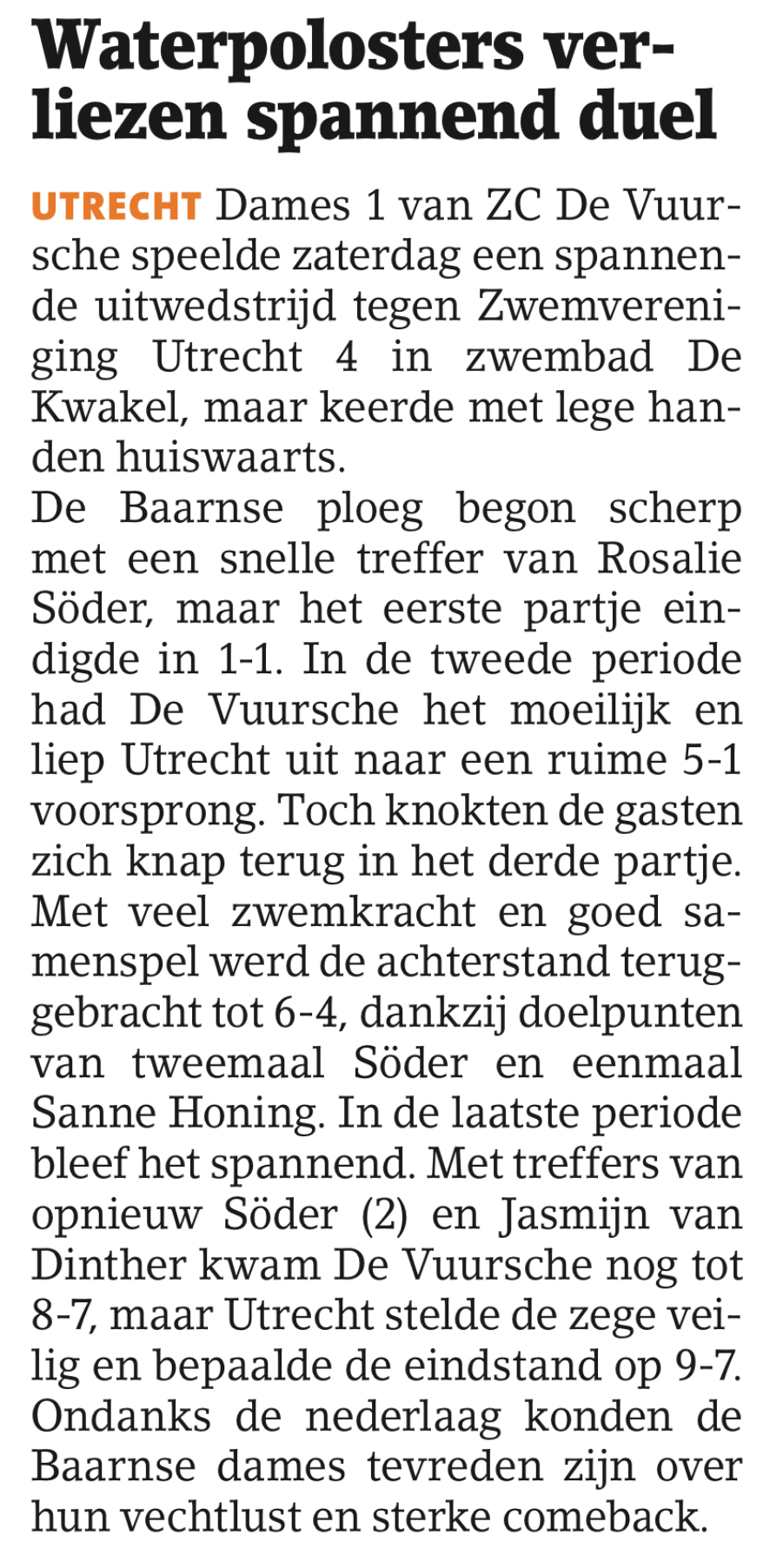De Baarnse ploeg begon scherp met een snelle treffer van Rosalie SΓΆder, maar het eerste partje eindigde in 1-1. In de tweede periode had De Vuursche het moeilijk en liep Utrecht uit naar een ruime 5-1 voorsprong. Toch knokten de gasten zich knap terug in het derde partje. Met veel zwemkracht en goed samenspel werd de achterstand teruggebracht tot 6-4, dankzij doelpunten van tweemaal SΓΆder en eenmaal Sanne Honing. In de laatste periode bleef het spannend. Met treffers van opnieuw SΓΆder (2) en Jasmijn van Dinther kwam De Vuursche nog tot 8-7, maar Utrecht stelde de zege veilig en bepaalde de eindstand op 9-7. Ondanks de nederlaag konden de Baarnse dames tevreden zijn over hun vechtlust en sterke comeback.