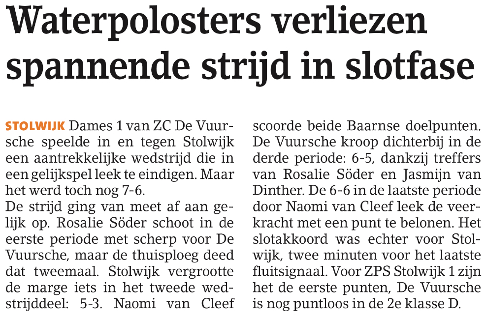 De strijd ging van meet af aan gelijk op. Rosalie SΓΆder schoot in de eerste periode met scherp voor De Vuursche, maar de thuisploeg deed dat tweemaal. Stolwijk vergrootte de marge iets in het tweede wedstrijddeel: 5-3. Naomi van Cleef scoorde beide Baarnse doelpunten. De Vuursche kroop dichterbij in de derde periode: 6-5, dankzij treffers van Rosalie SΓΆder en Jasmijn van Dinther. De 6-6 in de laatste periode door Naomi van Cleef leek de veerkracht met een punt te belonen. Het slotakkoord was echter voor Stolwijk, twee minuten voor het laatste fluitsignaal. Voor ZPS Stolwijk 1 zijn het de eerste punten, De Vuursche is nog puntloos in de 2e klasse D.