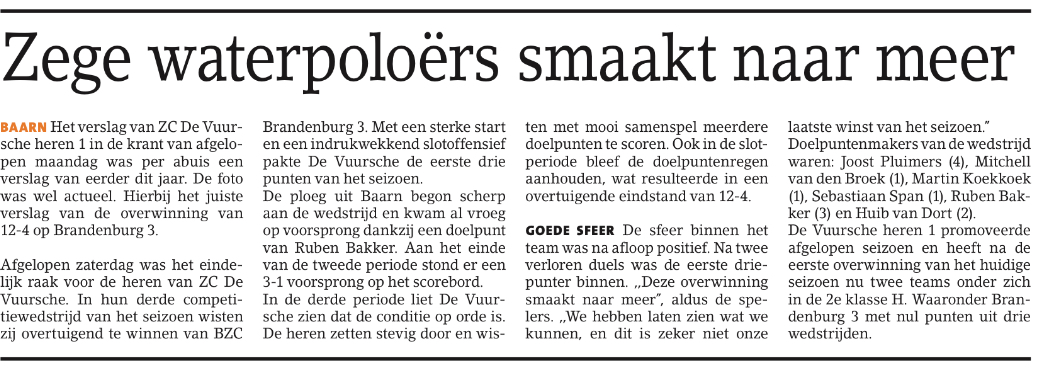 BAARN (rectificatie) Het verslag van ZC De Vuursche heren 1 in de krant van afgelopen maandag was per abuis een verslag van eerder dit jaar. De foto was wel actueel. Hierbij het juiste verslag van de overwinning van 12-4 op Brandenburg 3.