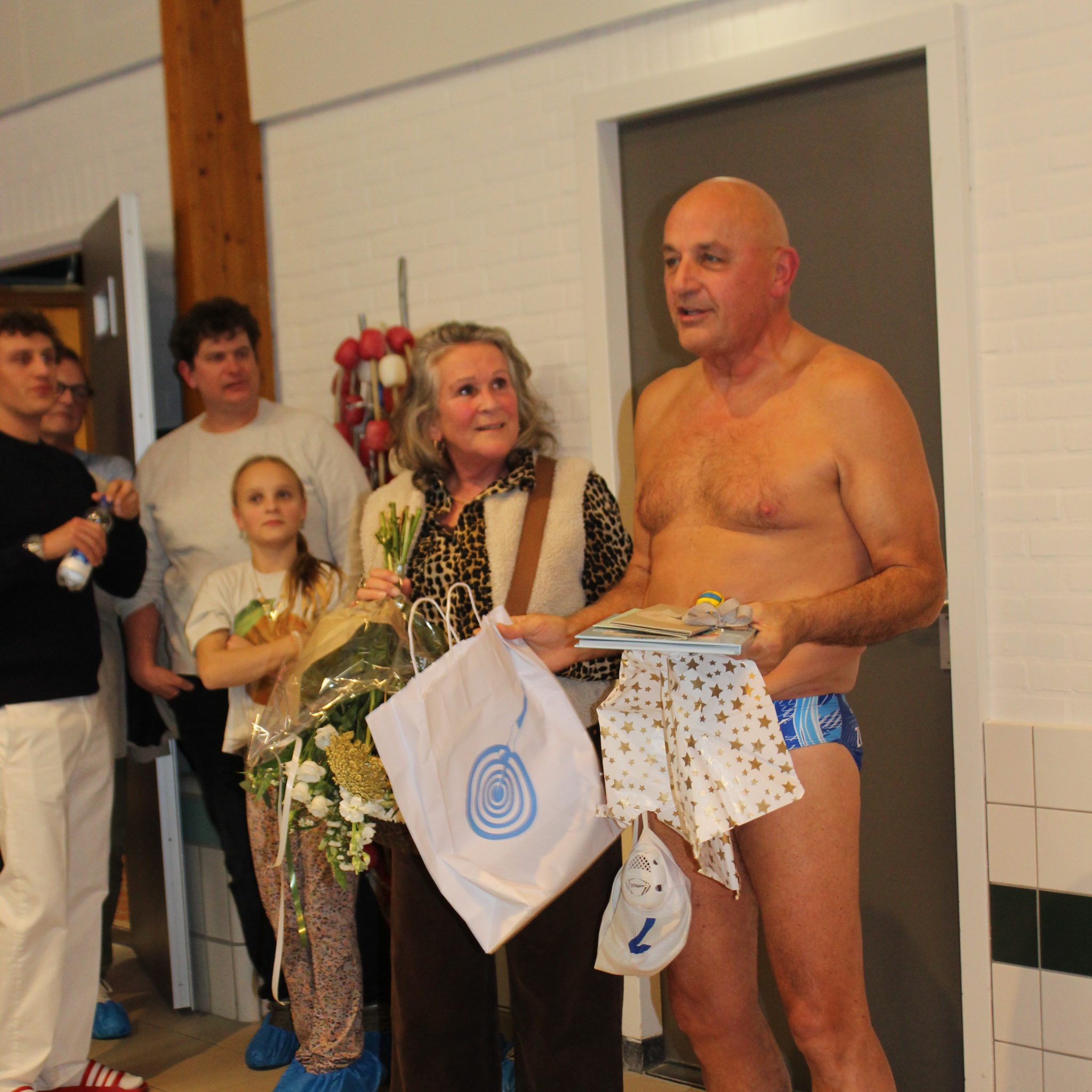 Namens de zwemclub ontving Herman een persoonlijk fotoboek met een impressie van 60 jaar lidmaatschap. Het fotoboek is samengesteld door archivaris Joke Hof. Herman was blij verrast met de aandacht voor dit heugelijke feit. Zijn echtgenote Bea ontving een bos bloemen. Daarna was het snel het water in voor het zoveelste partijtje waterpolo. In de vierde periode werd een door Herman gescoorde strafworp met extra luid applaus door het publiek bejubeld. Na afloop was er nog een drankje in de brasserie en wisten we inmiddels van Herman, dat als de gezondheid het toelaat hij zeker tot zijn tachtigste nog wel gemotiveerd is om het balletje te mogen gooien.
